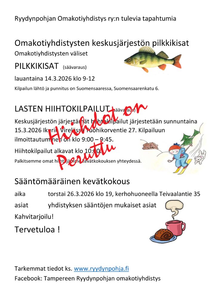 Lasten hiihtokilpailut oli tarkotus hiihtää Keskusjärjestön kilpailujen yhteydessä Ikurin Virelässä sunnuntaina 15.3.2026. Lumitilanne oli kuitenkin niin huono että kisat jouduttiin peruuttamaan.